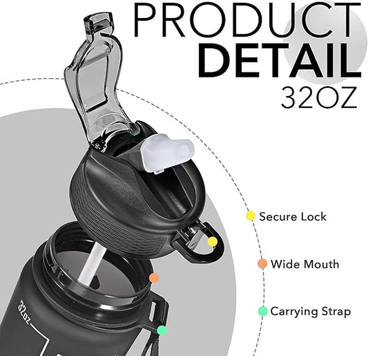 1L Motivational Water Bottle with Time Marker,Straw & Leakproof Design